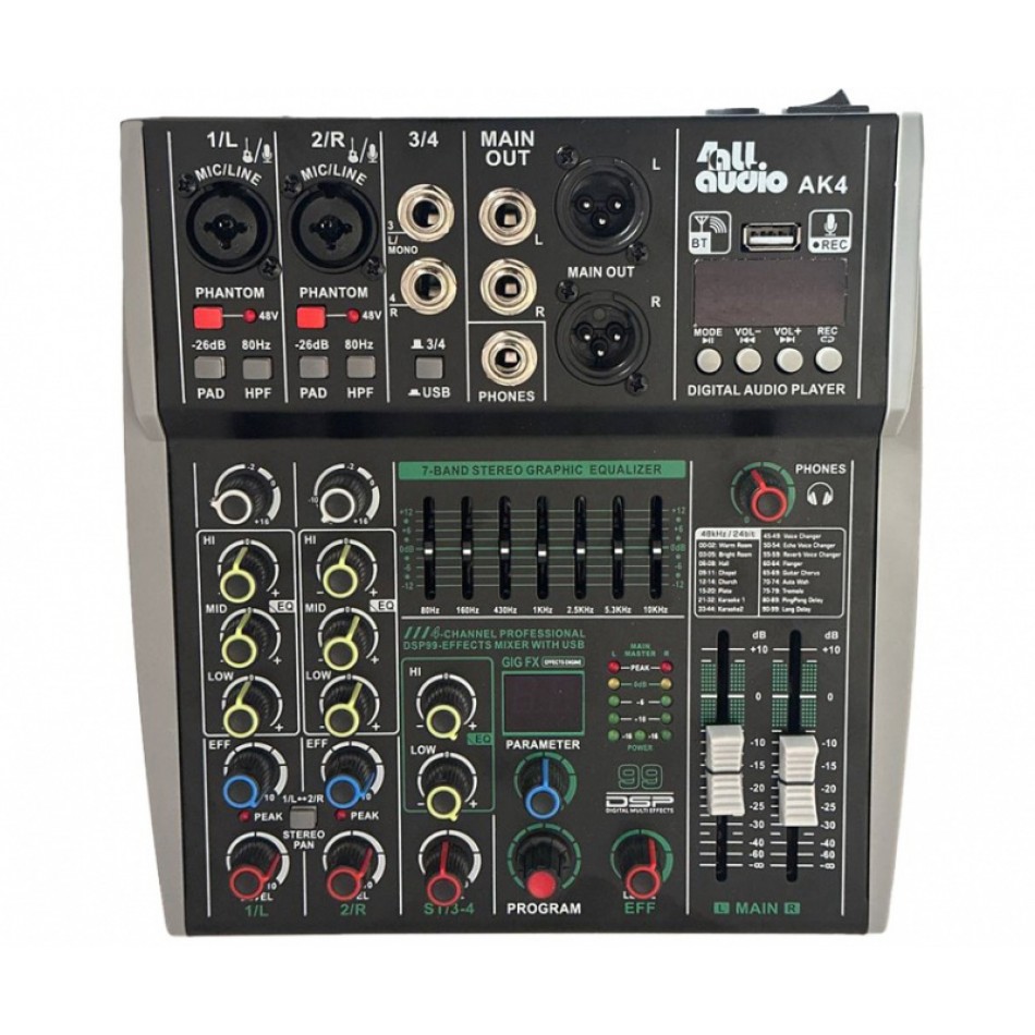 Мікшерний пульт 2 моно+1 стерео. Частотний діапазон: 10Hz-45KHz S/N rate 98dB. 7-смуговий еквалайзер. USB програвач. Bluetooth. DSP. Вмикач фантомного живлення