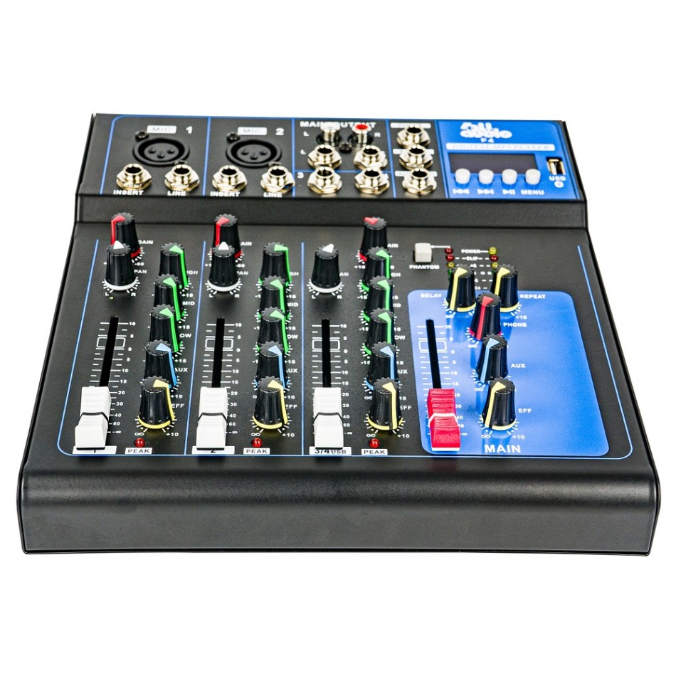 F4 Мікшерний пульт 2 моно+1 стерео. Частотний діапазон: 10Hz-45KHz S/N rate 98dB. Трисмуговий еквалайзер на кожному каналі. USB програвач. Bluetooth. Repeat, Delay. Вмикач фантомного живлення