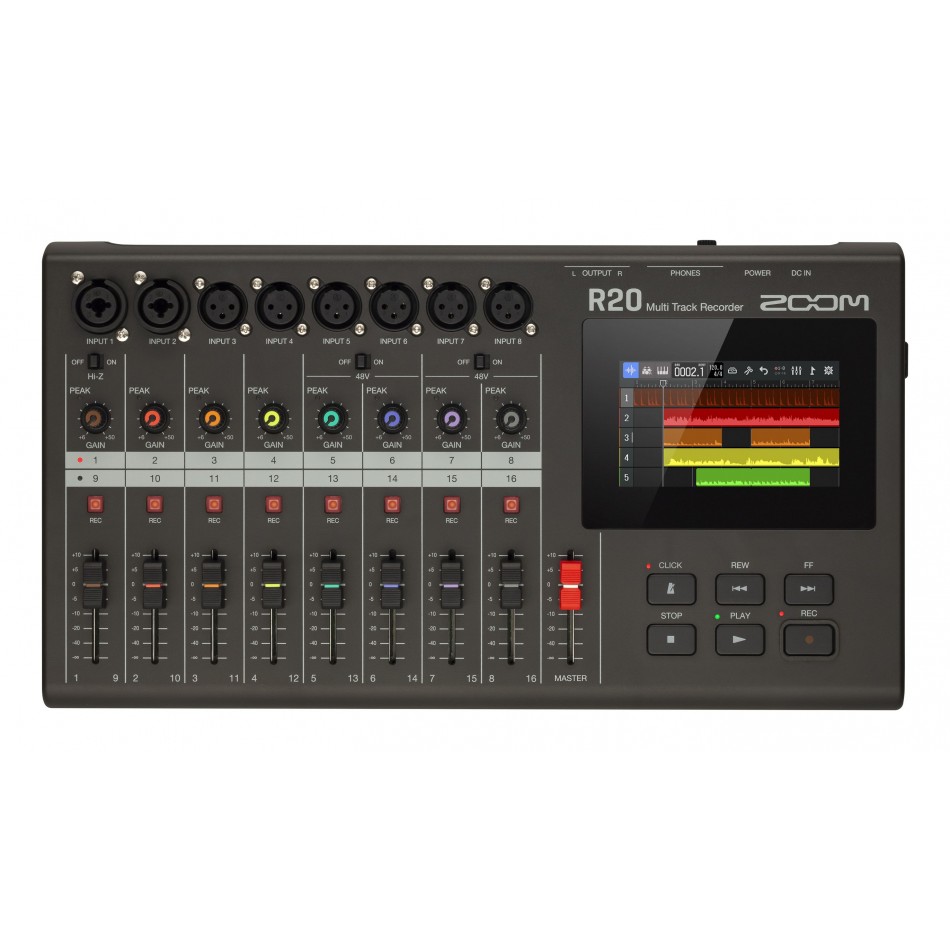 Zoom R20 - це портативний 16-ти канальний рекордер та аудіо інтерфейс 8-in/2-out, 24-bit/44.1kHz, 8 мікро. преамп, фант. живлення, вхід для гітари, ефекти, сенсорний дисплей, підтримка запису на карти пам'яті. Zoom R20 оснащений 4,3-дюймовим сенсорним екраном для дорожнього редагування в стилі DAW, вперше для портативних рекордерів Zoom. На екрані відображаються "звукові регіони", як у вашій улюбленій програмі DAW, і ви можете розділяти, копіювати, вставляти, зациклювати та переміщувати регіони одним торканням пальця. Доріжки мають колірне кодування та відповідають кольорам вхідних каналів.В комплект входять блок живлення ZAD-1220, мануал та програмне забезпечення Steinberg Cubase LE. Додаткові аксесуари (Додаткові аксесуари (купуються окремо!) Bluetooth-адаптер BTA-1 та сумка для перенесення CBR-16.